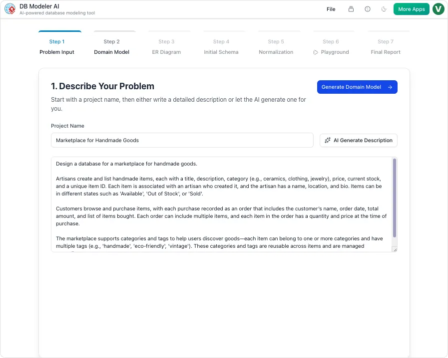 • DBModeler AI: Analyzes plain-text descriptions (e.g., “Users can place orders, each order has multiple items”) and identifies: