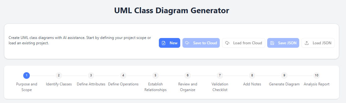 The Visual Paradigm AI-Assisted UML Class Diagram Generator is a free, browser-based, interactive tool designed to help users—ranging from students and educators to developers, architects, business analysts, and hobbyists—create professional UML class diagrams quickly and efficiently. It combines a structured 10-step guided wizard with AI assistance at multiple stages, allowing you to start from a simple text idea (e.g., “a university course registration system”) and progress to a complete, validated, documented, and exportable diagram.