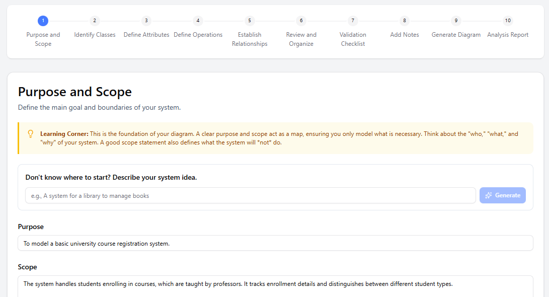 • Generate button: AI expands a short prompt into a clear Purpose statement and detailed Scope (including “what the system will not do”).