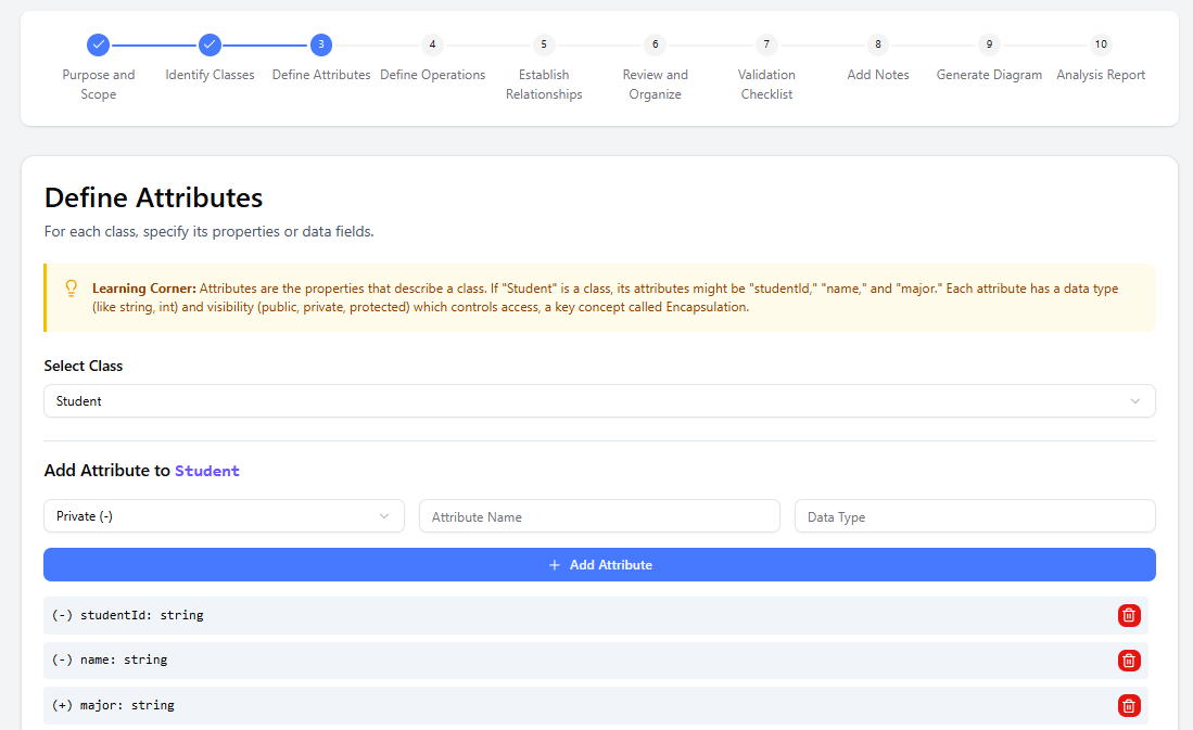 3. Define Attributes Add properties/data fields to each class (e.g., Student → studentId: String, name: String, gpa: double).