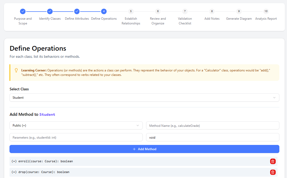 4. Define Operations Add methods/behaviors (e.g., Course → enrollStudent(), getEnrollmentCount()).