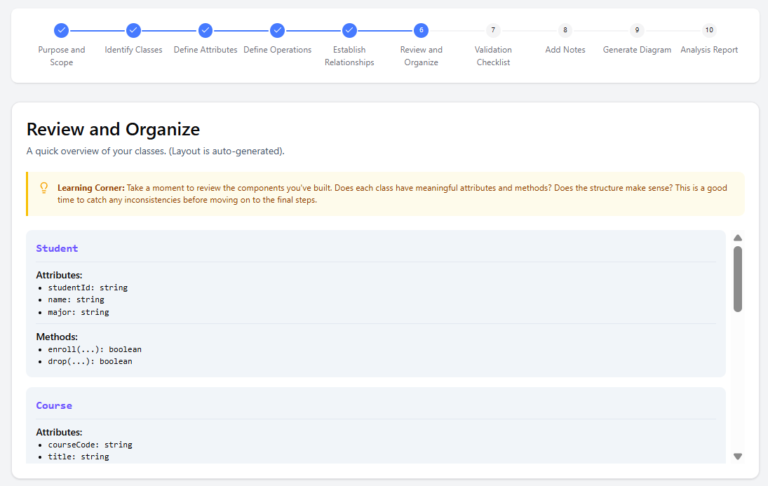 10. Analysis Report AI-powered critique: identifies patterns (e.g., good use of inheritance), suggests improvements (e.g., “consider interface for payment”), assesses maintainability, completeness, adherence to SOLID/OO principles, etc.