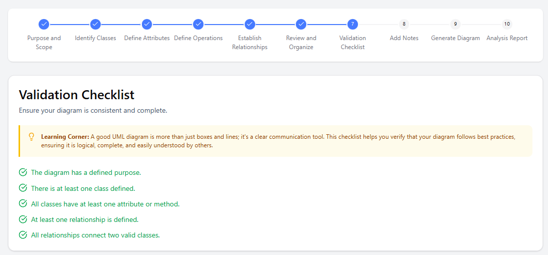7. Validation Checklist Automated check against UML best practices (e.g., missing multiplicities, unclear names, violated principles).