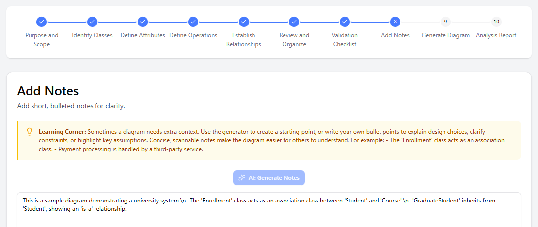 8. Add Notes Add manual annotations or let AI generate summary/explanatory notes (rationale, design decisions, key patterns).